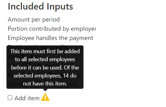 - Select the Add Item checkbox after viewing the Included Inputs. You may add as many items as you like.